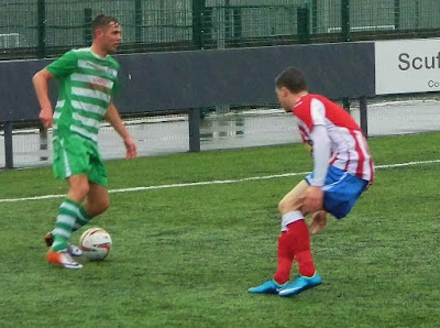 Both teams kits looked good on this dark and dismal day and they certainly brightened up proceedings with the red and blue of Stockport well matched by the green and white hoops of Holker Old Boys.